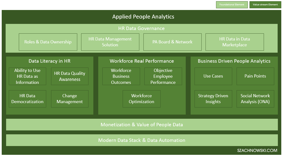 The Applied People Analytics model contains 3 foundational elements and 3 value-stream elements.